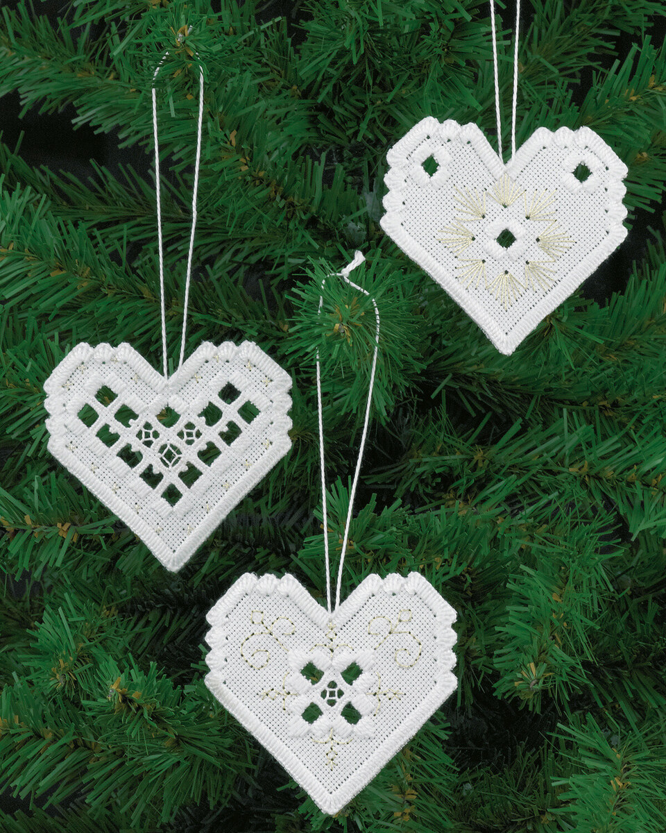 Discover the serene beauty of traditional needlework with our Embroidery Kit Hardanger Heart x3. Crafted for lovers of delicate and detailed stitching, this set features three charming hearts, each perfect as a sweet decoration or a heartfelt gift. With a classic white palette enhanced by subtle metallic and pearl accents, these designs encapsulate both simplicity and elegance, fitting beautifully into any home decor.
