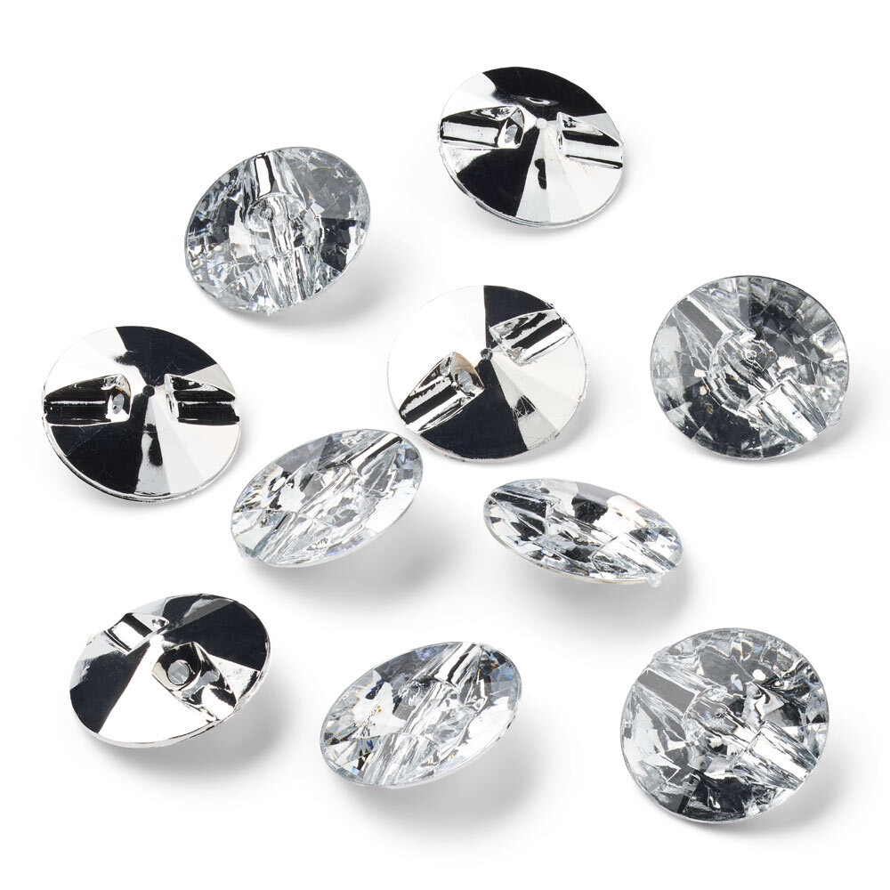 These clear crystal buttons from LindeHobby combine function and elegance in one product. Measuring 20 mm in diameter, the buttons are sold in packs of 10. The faceted surface reflects light beautifully, while the smooth back with hidden sewing hole ensures an unbroken and neat look on the front.