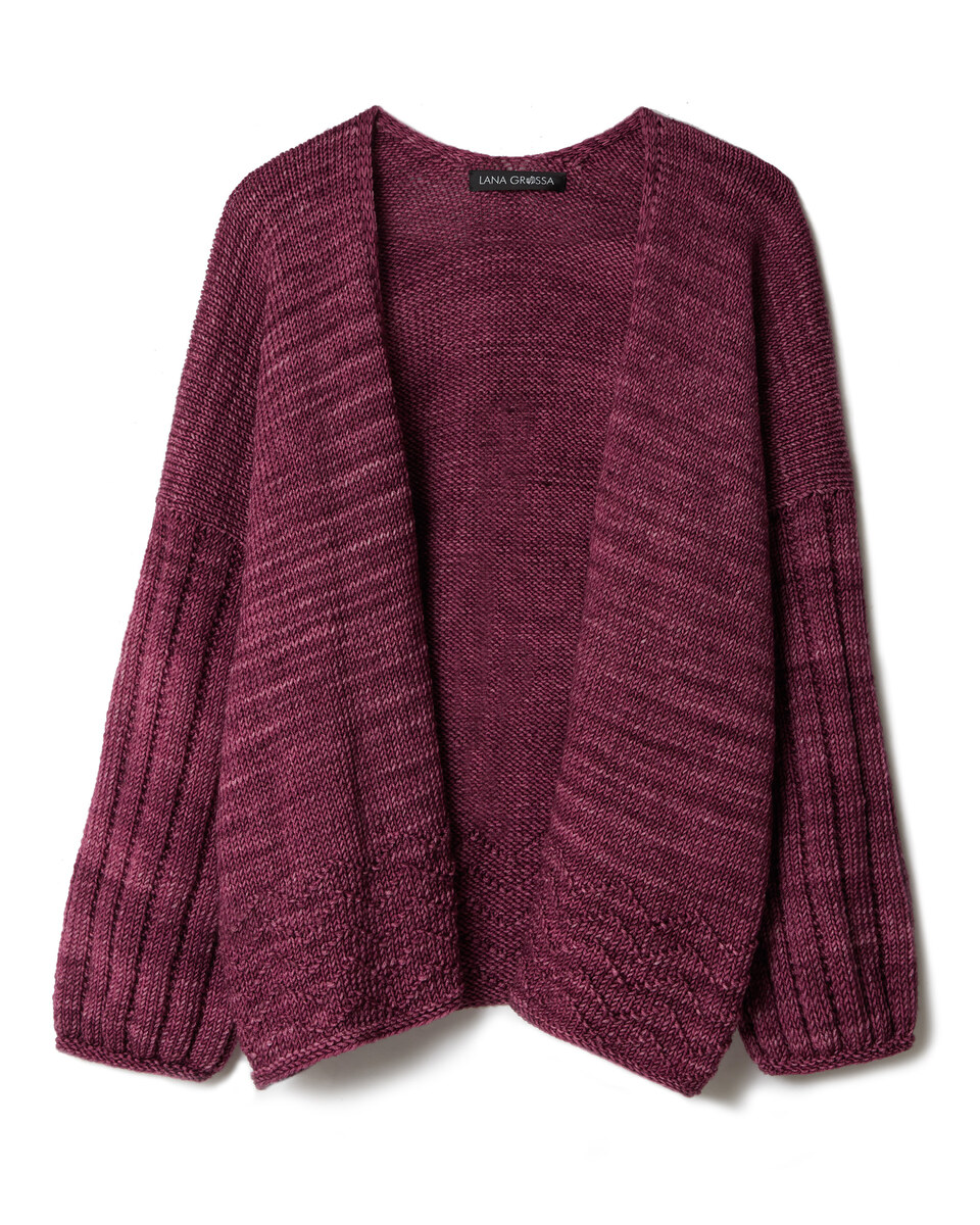 Yarn: The light cardigan is knitted in Lana Grossa Cool Wool Big: 450 (500 – 500 – 550 – 600) g in color 1016 Shell, and the bordeaux cardigan in Lana Grossa Cool Wool Big Vintage: 450 (500 – 500 – 550 – 600) g in color 7165 Plum
