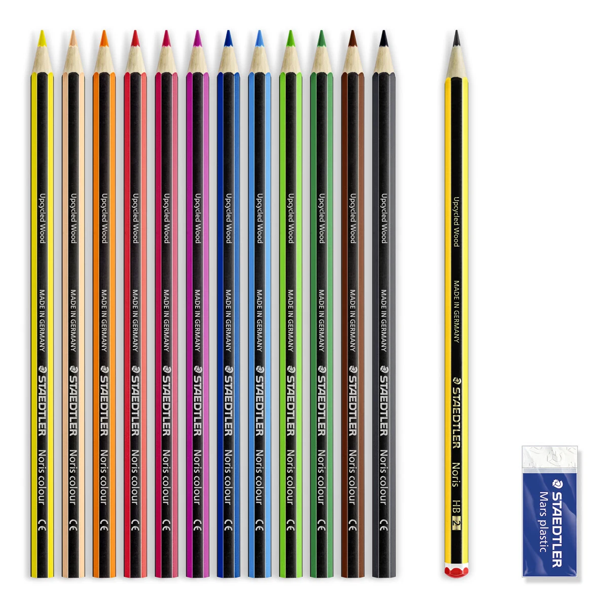 Contents: 12 Noris colour coloured pencils (assorted colours) + 1 Noris pencil + 1 Mars Plastic mini eraser, unsleeved