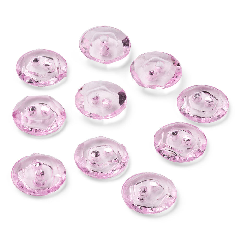 These lilac crystal buttons from LindeHobby measure 12 mm in diameter and are supplied in a pack of 10 pcs. The buttons are made of clear plastic with a faceted surface that gives a subtle sheen of gloss and colour.