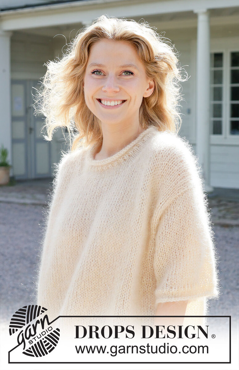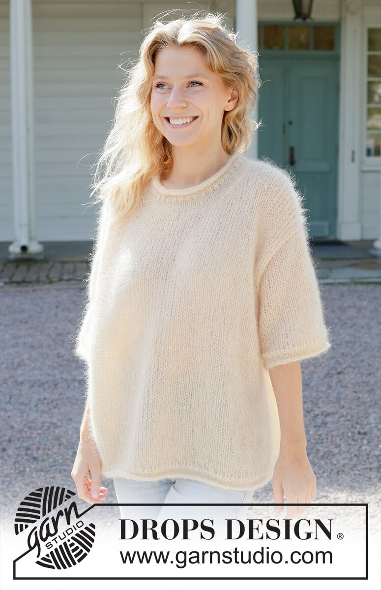 Knitted oversized jumper in 4 strands DROPS Kid-Silk. The piece is knitted top down with European shoulder / diagonal shoulder, short sleeves and rolling edges. Size XS – XXL.
