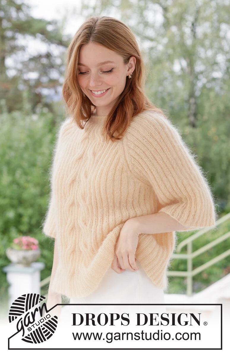 Knitted jumper in 2 strands DROPS Kid-Silk. The piece is worked top down with raglan, cables and rib. Sizes XS - XXXL.